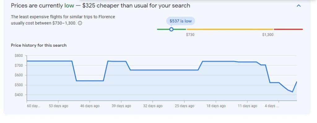 Prices for flights change often, sometimes several times a week. So, how do you know the price is right and it is time to buy your ticket? The price history feature mentioned above is the tool to use. It helps you decide whether to book now or later.