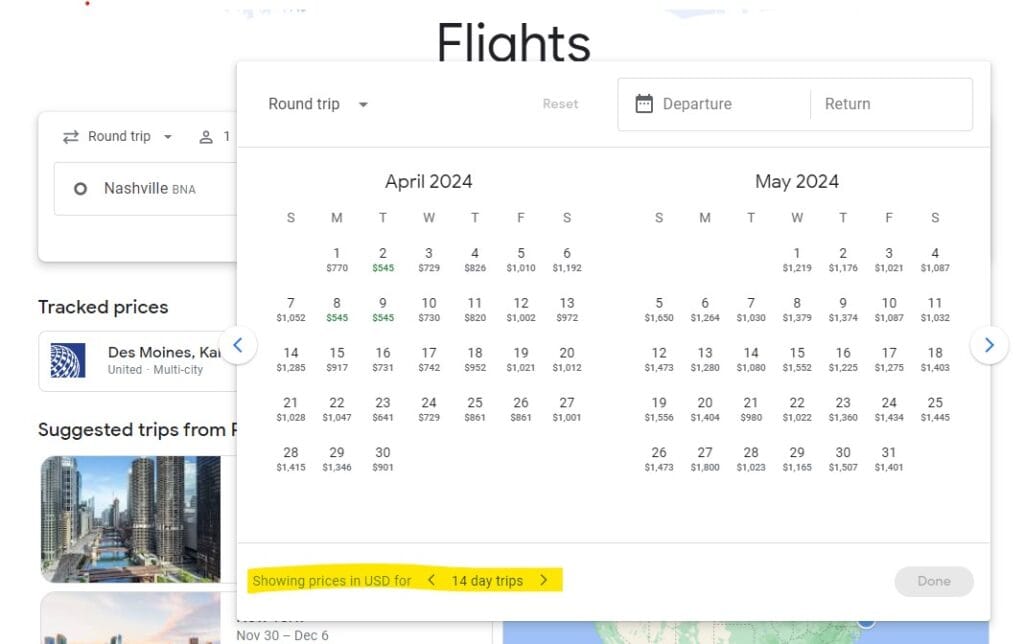 The calendar inset above will appear with prices under each date. As you see, there can be a large price difference between the highest and lowest cost dates (over $600 in this case). Rates also change over time, which is where the power of tracking prices comes in.