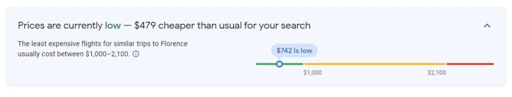 As you see above, where the colors change is the benchmark for low, typical, and expensive fares. The amounts come from data of tickets with comparable departure and destination, number of stops, and class over the past 12 months. This is your guide for when to buy tickets.